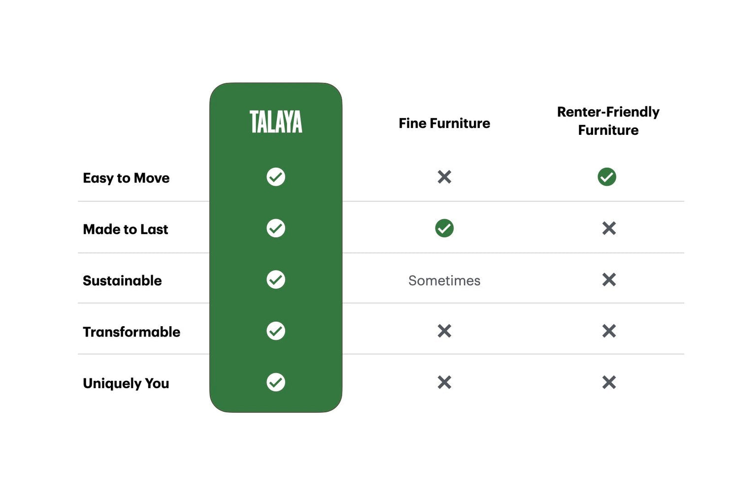 An adaptable base for any space, our tiles won't end up in the trash like today's low-quality, trend-dependent, easily damaged "renter-friendly" furniture. Talaya's high-quality reusable tiles are built to last from non-toxic, natural, renewable materials in limited runs using a process designed to minimize waste - because style should never sacrifice function, your health or your values.
